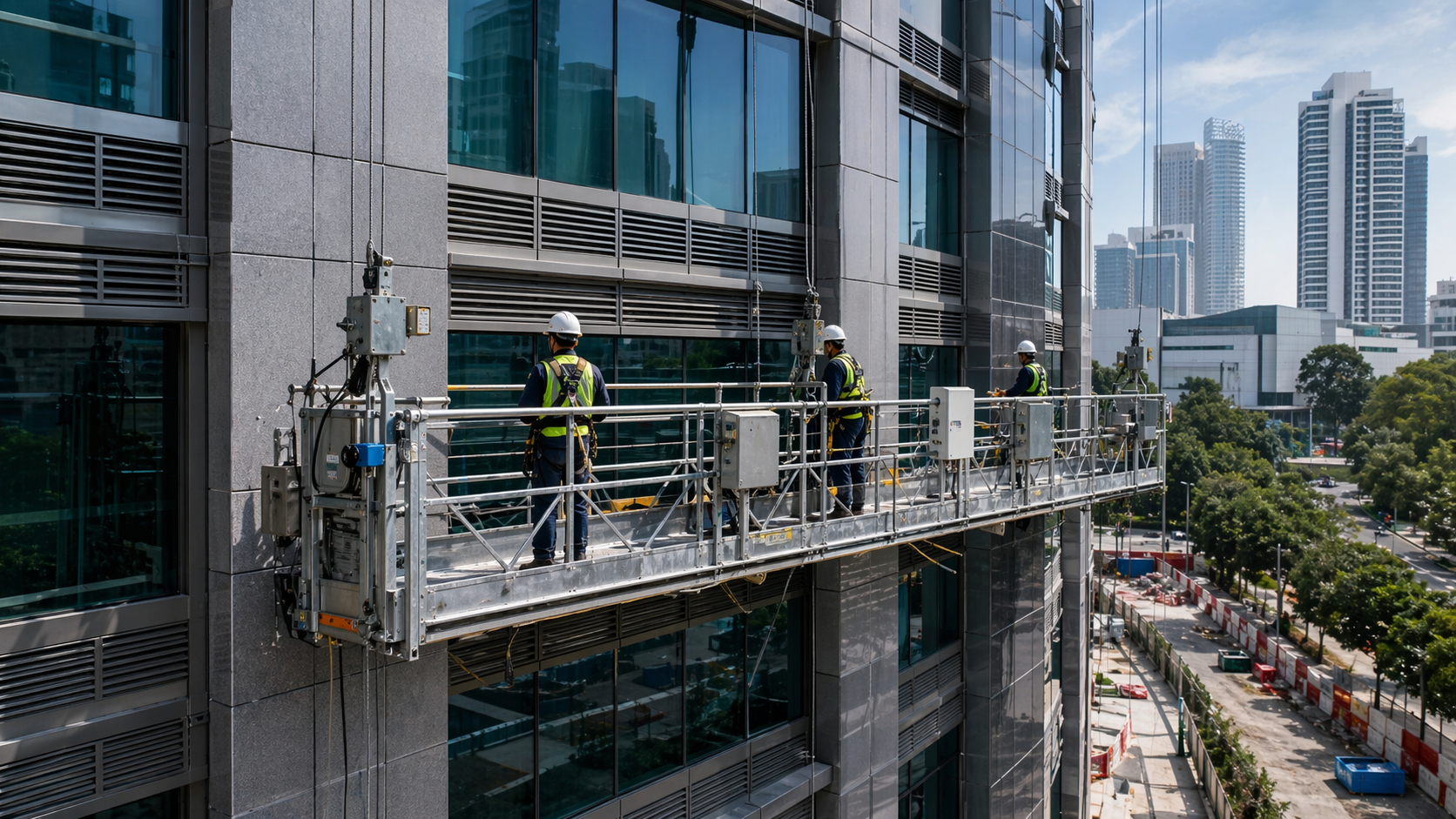 Suspended access platform arranged for facade inspection, maintenance, and controlled external works.