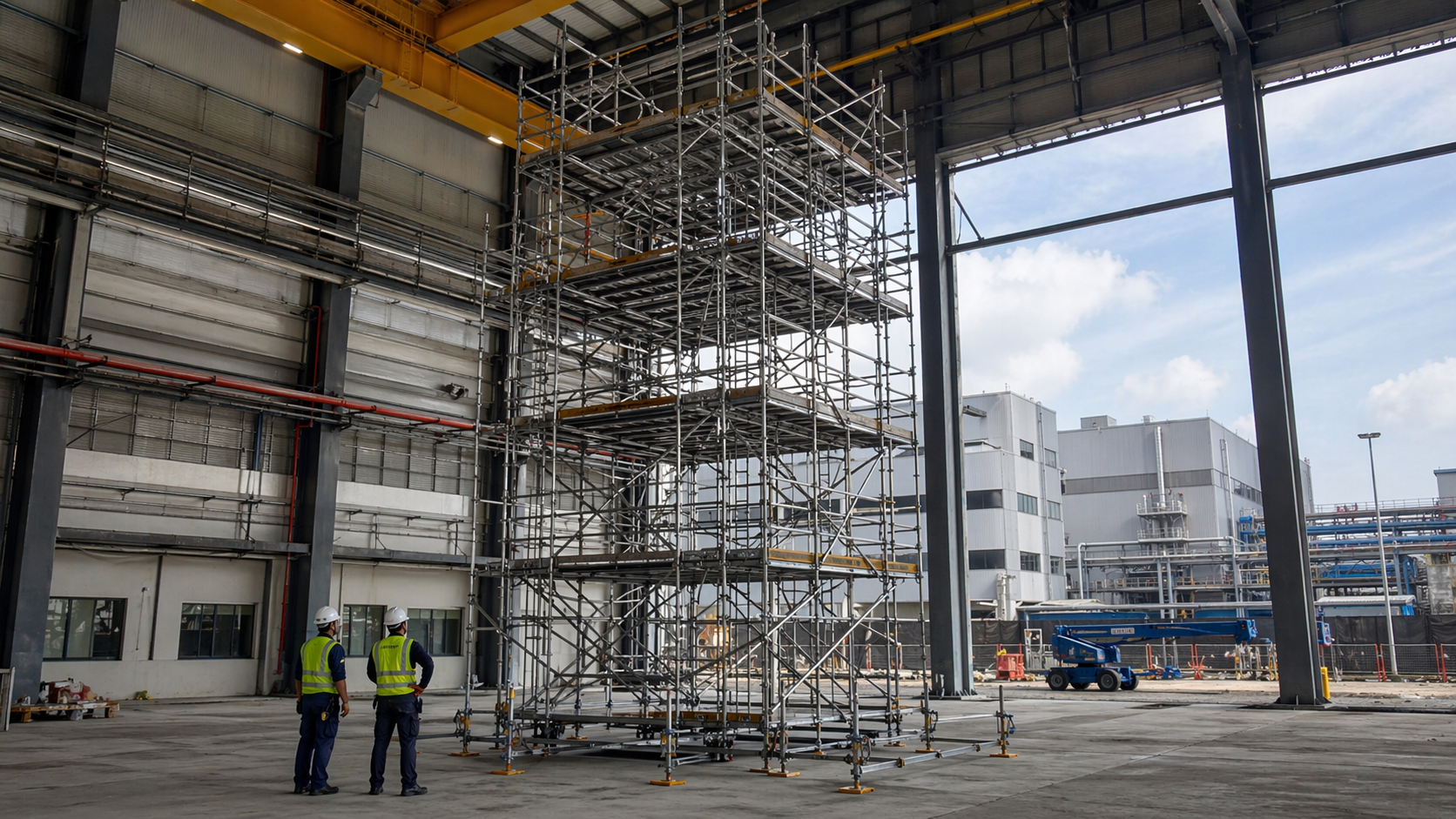 Clean room scaffold arranged for sensitive interior maintenance with protected bases and neat access control.